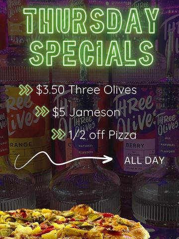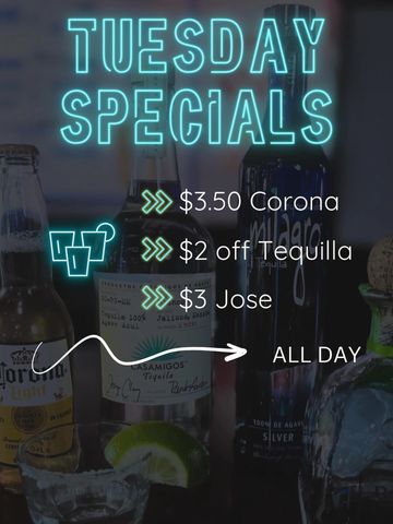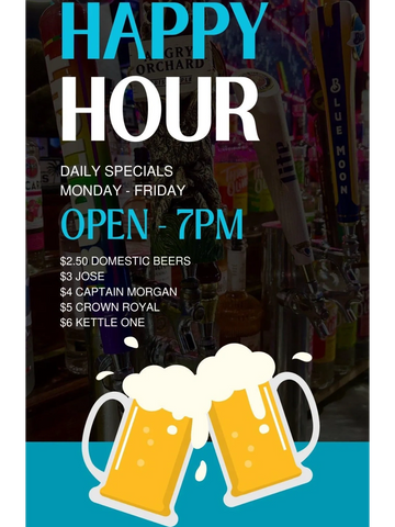 LUNCH SPECIALS OPEN-4PM, TUESDAY - FRIDAY, $2 OFF SELECT ITEMS. HAPPY HOUR OPEN -7PM, MONDAY - FRIDAY, $1 OFF SELECT APPS.